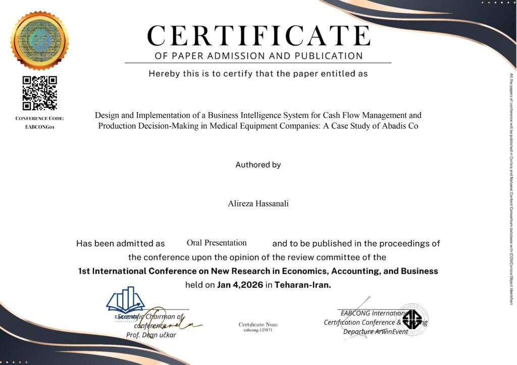 مقاله علمی جناب آقای علیرضا حسنعلی، مدیرعامل شرکت مخازن طبی آبادیس، با عنوان: «طراحی و پیادهسازی سیستم هوش تجاری برای مدیریت نقدینگی و تصمیمگیری تولید در شرکتهای تجهیزات پزشکی: مطالعه موردی آبادیس»