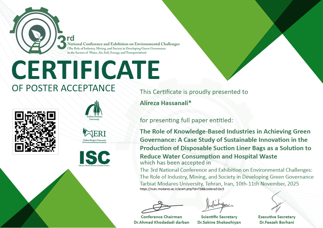 در این رویداد، جناب آقای علیرضا حسنعلی مدیرعامل و همبنیانگذار شرکت دانشبنیان مخازن طبی آبادیس مقالهای با عنوان:**«نقش صنایع دانشبنیان در تحقق حکمرانی سبز: مطالعه موردی نوآوری پایدار در تولید کیسه ساکشن یکبارمصرف بهعنوان راهکاری برای کاهش مصرف آب و پسماند بیمارستانی»**را ارائه کردند.